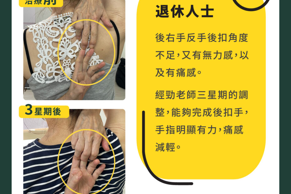 〖個案分享〗五十肩肩頸問題 勁老師所有個案 〖個案分享〗退休姨姨後右手反手後扣角度不足,又有無力感,以及有痛感。經勁老師三星期的調整,能夠完成後扣手,手指明顯有力,痛感減輕。 #手診 #手診勁 #個案分享 #五十肩